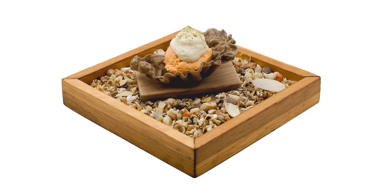 - Ingredientes: Brioche, calamar, tomate seco, ajo negro, ajo, yema de huevo, aceite, pesto, pan frito, albahaca, parmesano y almendras.