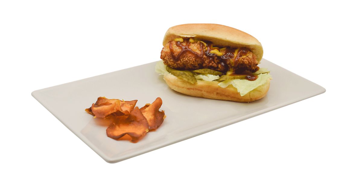 - Ingredientes: Gambón, pepinillo, lechuga, pan brioche, chip de boniato, kétchup de langostino, mostaza.