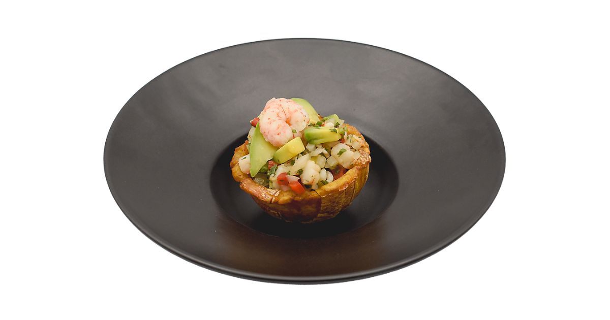- Ingredientes: Plátano verde, gambón, cebolla morada, pimientos rojos y verdes, cilantro, jengibre, ajo, ají dulce; limón, aguacate, huevas de salmón, aceite de oliva, pimienta cayena.