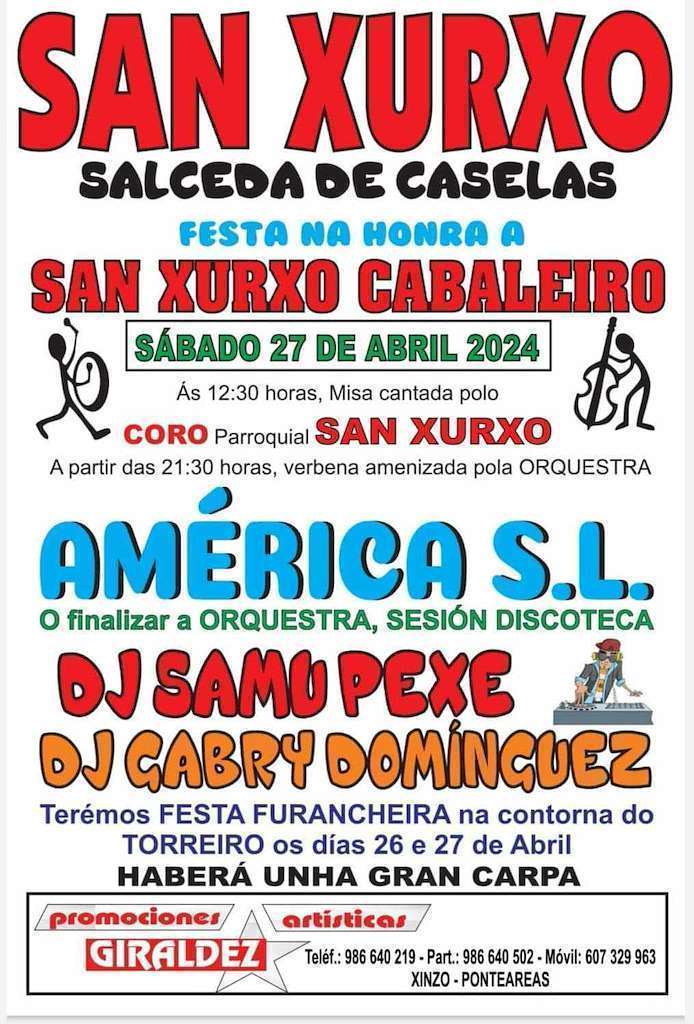 La verbena llega a Salceda este sábado 27 de abril. La parroquia de San Xurxo celebra sus fiestas patronales a partir de las 12:30 horas, que empezará con los actos religiosos. Tras una tarde de ‘Festa furancheira’ en la contorna del torreiro, a partir de las 21:30 horas, la orquesta América S.L. brindará su espectáculo, pero la música seguirá sonando hasta altas horas de la noche gracias a los DJs Samu Pexe y Gabri Domínguez. Desde la organización indican que habrá “una gran carpa”.