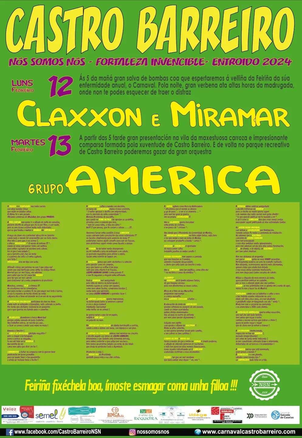 Por su parte, Castro Barreiro ofrecerá por esa misma noche del lunes una “gran verbena hasta altas horas de la madrugada y donde no te puedes olvidar de traer tu disfraz”, cuya banda sonora estará a cargo de las orquestas Claxxon y Miramar.