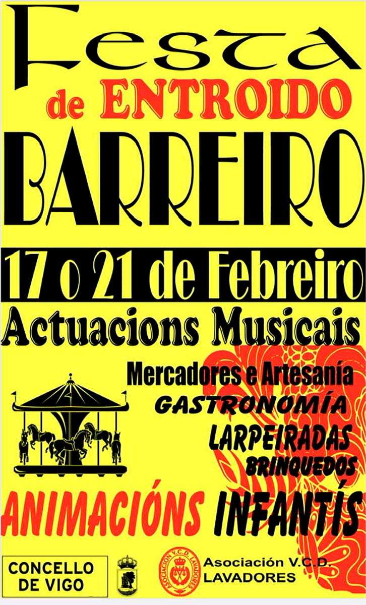 En el caso de la parroquia viguesa de Lavadores, el Entroido se celebrará en Barreiro. La fiesta comenzará el viernes 17 y se extenderá hasta el martes 21 de febrero con un mercado de artesanías todos los días a partir de las 18:00 horas, actuaciones musicales a las 20:30 horas, atracciones, pintacaras, gastronomía y animación infantil.