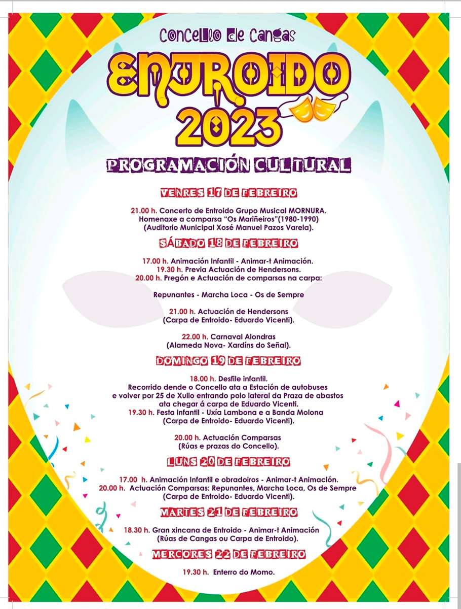 Cangas do Morrazo le dará el pistoletazo de salida a su programación de Entroido este viernes, con un concierto a cargo del grupo musical Mornura. Hasta el miércoles 22 de febrero el programa acogerá numerosas citas como el pregón y las actuaciones de las comparsas, el desfile infantil el domingo 19, una gran yincana de Entroido el martes 21 y el Enterro do Momo el miércoles 22.