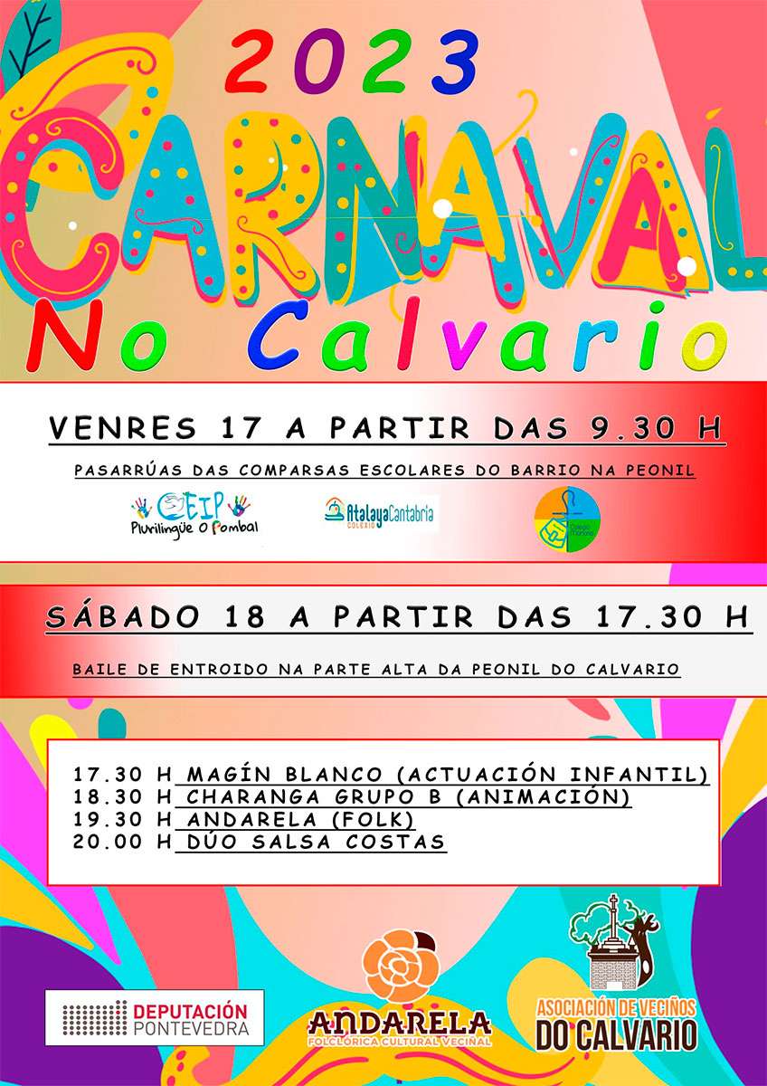 En O Calvario, el Entroido arrancará con el pasacalles de las comparsas escolares del barrio por la peatonal el viernes 17 a partir de las 9:30 horas. Al día siguiente, el sábado 18 de febrero, a partir de las 17:30 horas se celebrará un baile de Entroido en la parte alta de la peatonal de O Calvario, que contará con la actuación infantil de Magín Blanco a las 17:30 horas, la Charanga Grupo B a las 18:30 horas, la actuación de Andarela a las 19:30 horas y el Dúo Salsa Costas a las 20:00 horas.