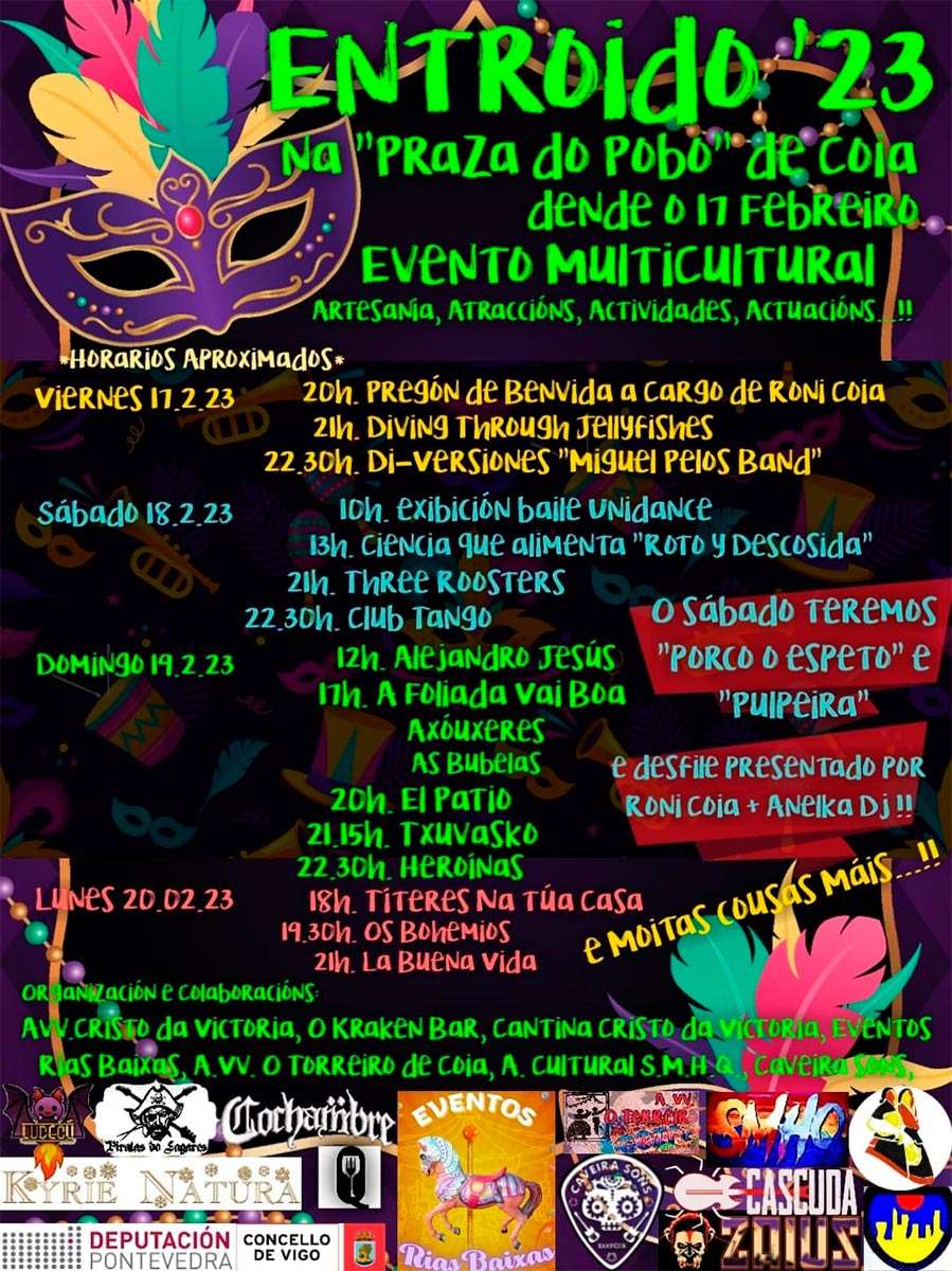 Además de esta programación, la ciudad olívica también podrá disfrutar de las fiestas de Entroido de Coia, Bouzas, Lavadores y O Calvario. Las celebraciones en Coia tendrán lugar en la "Praza do Pobo" a partir del viernes 17 y hasta el lunes 20 de febrero. Durante las cuatro jornadas habrá actuaciones musicales, un desfile, oferta gastronómica y actividades infantiles. Bouzas, por su parte, festejará el Entroido el sábado 18 de febrero con una fiesta en la Alameda, que contará con la actuación del grupo Sehiba a las 19:00 horas. La siguiente cita será el III Enterro da Rincha, que tendrá lugar el sábado 25 de febrero a partir de las 17:00 horas. Para consultar la programación de ambas fiestas haga clic aquí.