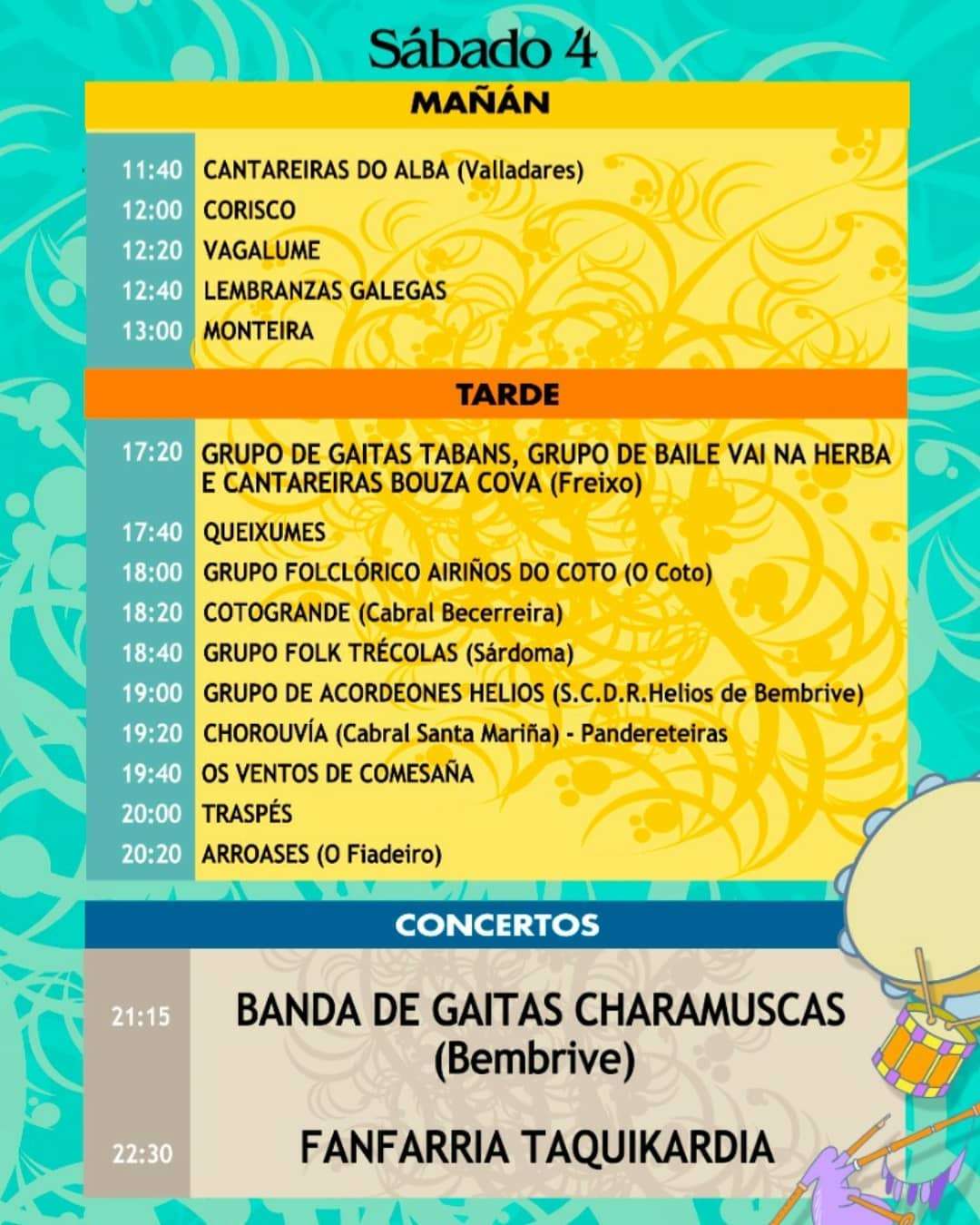 Por otro lado, el sábado 4 de septiembre la Festa da Cultura continúa en Praza de Compostela con las actuaciones por la mañana, desde las 11:40 horas, de Cantareiras do Alba, Corisco, Vagalume, Lembranzas Galegas y Monteira. Ya en turno de tarde será el momento del Grupo de Gaitas Tabans, Grupo de Baile Vai na Herba e Cantareiras Bouza Cova (Freixo), Queixumes, Grupo Folclórico Airiños do Coto (O Coto), Cotogrande (Cabral Becerreira), Grupo Folk Trécolas (Sárdoma), Grupo de Acordeones Helios (Helios de Bembrive), Chorouvía (Cabral Santa Mariña), Os Ventos de Comesaña, Traspés, Arroases (O Fiadeiro). La jornada finalizará a partir de las 21:15 horas con los conciertos de la Banda de Gaitas Charamuscas de Bembrive y Fanfarria Taquikardia.