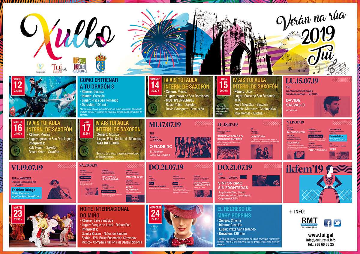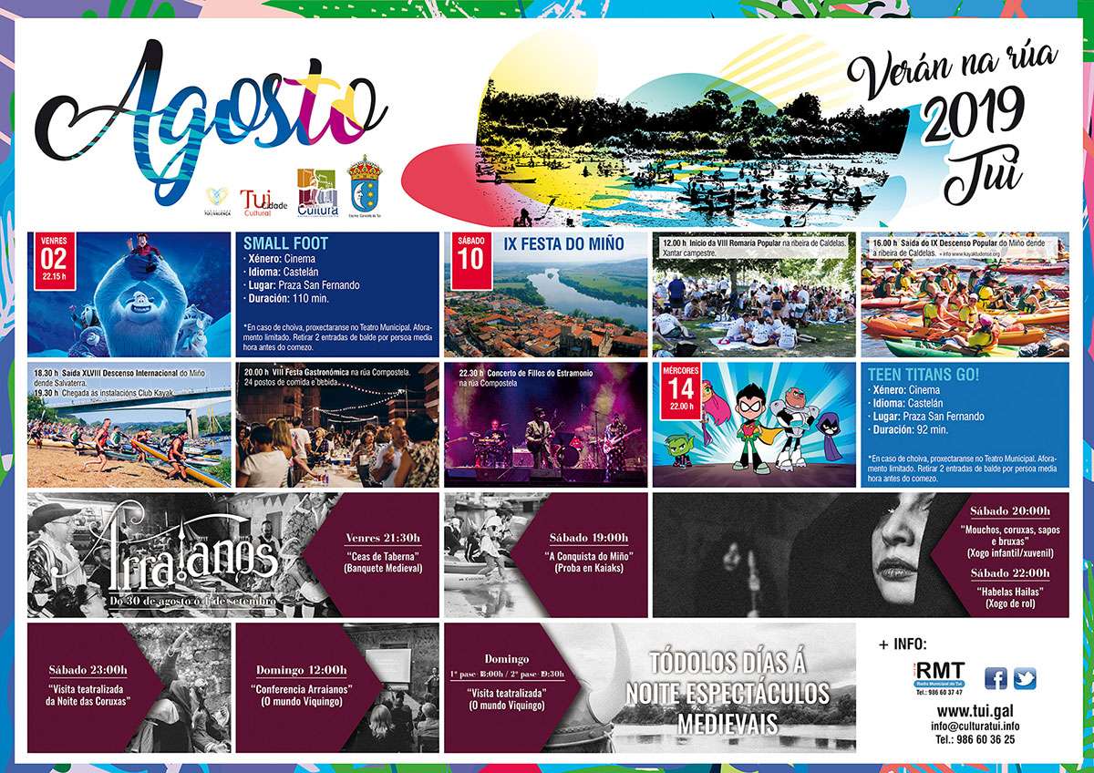 La programación nos llevará en el mes de agosto al Tui del futuro, el Tui que quiere volver a abrazar al río Miño. El sábado, 10 de agosto, se celebrará la IV Festa do Miño, una celebración que se prepara este año para el décimo aniversario que celebrará en 2020 y que, en palabras del alcalde de Tui, contará con “más transcendencia en el futuro”. La cita arrancará con la tradicional Romería Popular en la Ribeira de Caldelas que finalizará con la comida campestre. Un año más se celebrará el Descenso Popular y el Internacional, que llenará de kayaks el curso fluvial en una de las citas deportivas más espectaculares de la provincia. A partir de las 20:00 horas la céntrica calle Compostela acogerá la Festa Gastronómica y el concierto Fillos do Estramonio.