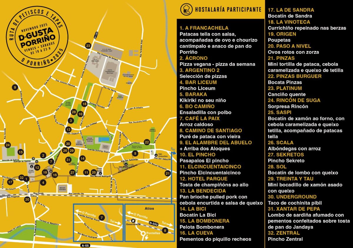 Se trata de una cita organizada por la Asociación de Hosteleiros de O Porriño, en colaboración con el Concello, y que se celebrará todos los viernes y sábados durante el mes de noviembre, aunque su inicio será este 31 de octubre. Las personas interesadas en probar algunas de las propuestas culinarias podrán hacerlo entre cualquiera de los 32 establecimientos participantes entre las 19:00 y las 23:00 horas. El precio de cada una de las tapas y pinchos es de 1,5 euros.