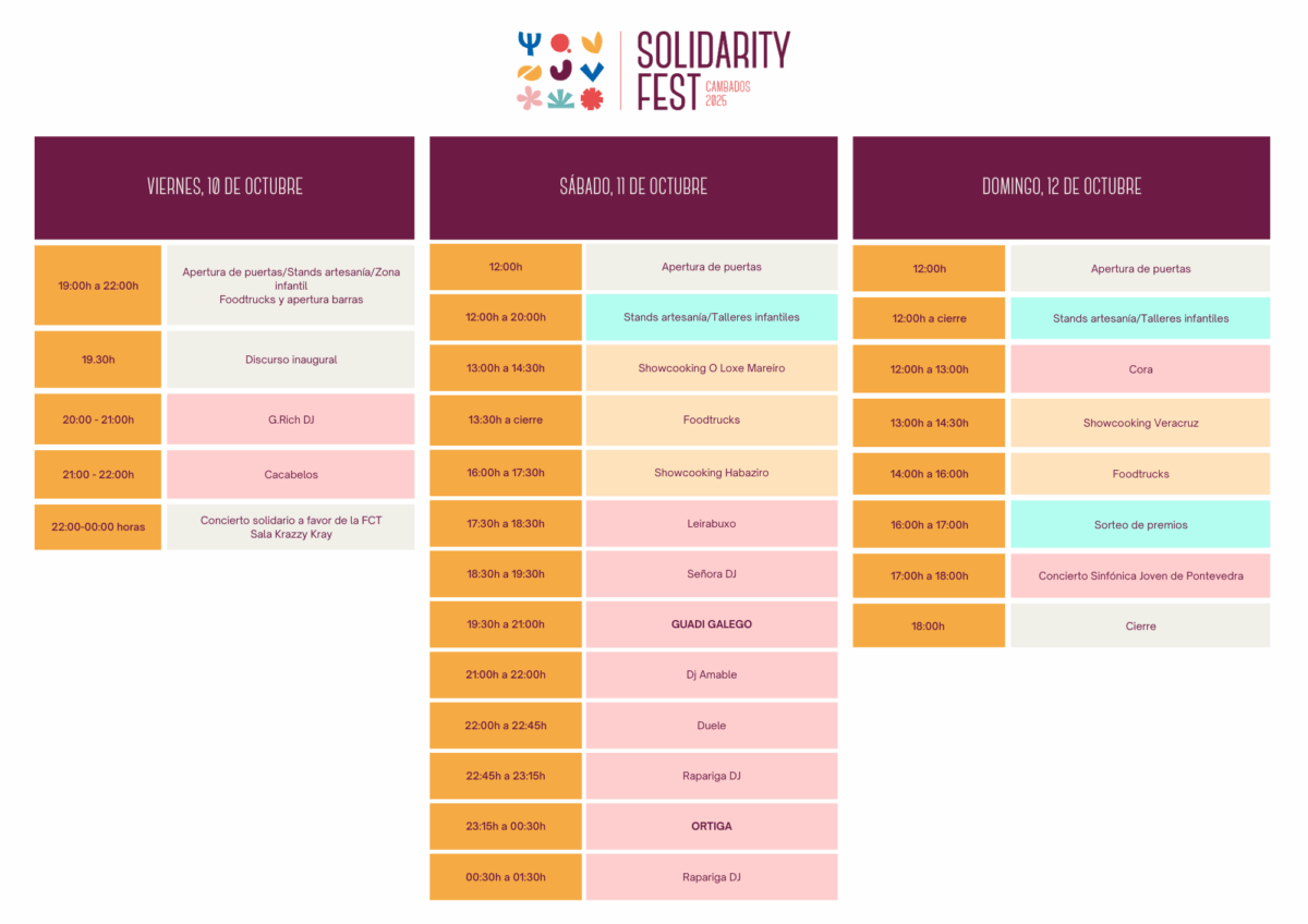 El Solidarity Fest 2025 se celebra del 10 al 12 de octubre en los jardines del Pazo de Torrado de Cambados. La organización señala que se vivirá un festival "único" con un "propósito muy especial": recaudar fondos para proyectos de investigación en oncología del Instituto de Investigación Sanitaria de Santiago de Compostela. Para esta cita están confirmadas las actuaciones de artistas como Guadi Galego, Ortiga, Señora Dj o la Sinfónica Joven de Pontevedra, entre otros. Además, el evento contará con showcookings, foodtrucks, puestos de artesanía, talleres infantiles y un sorteo de premios.