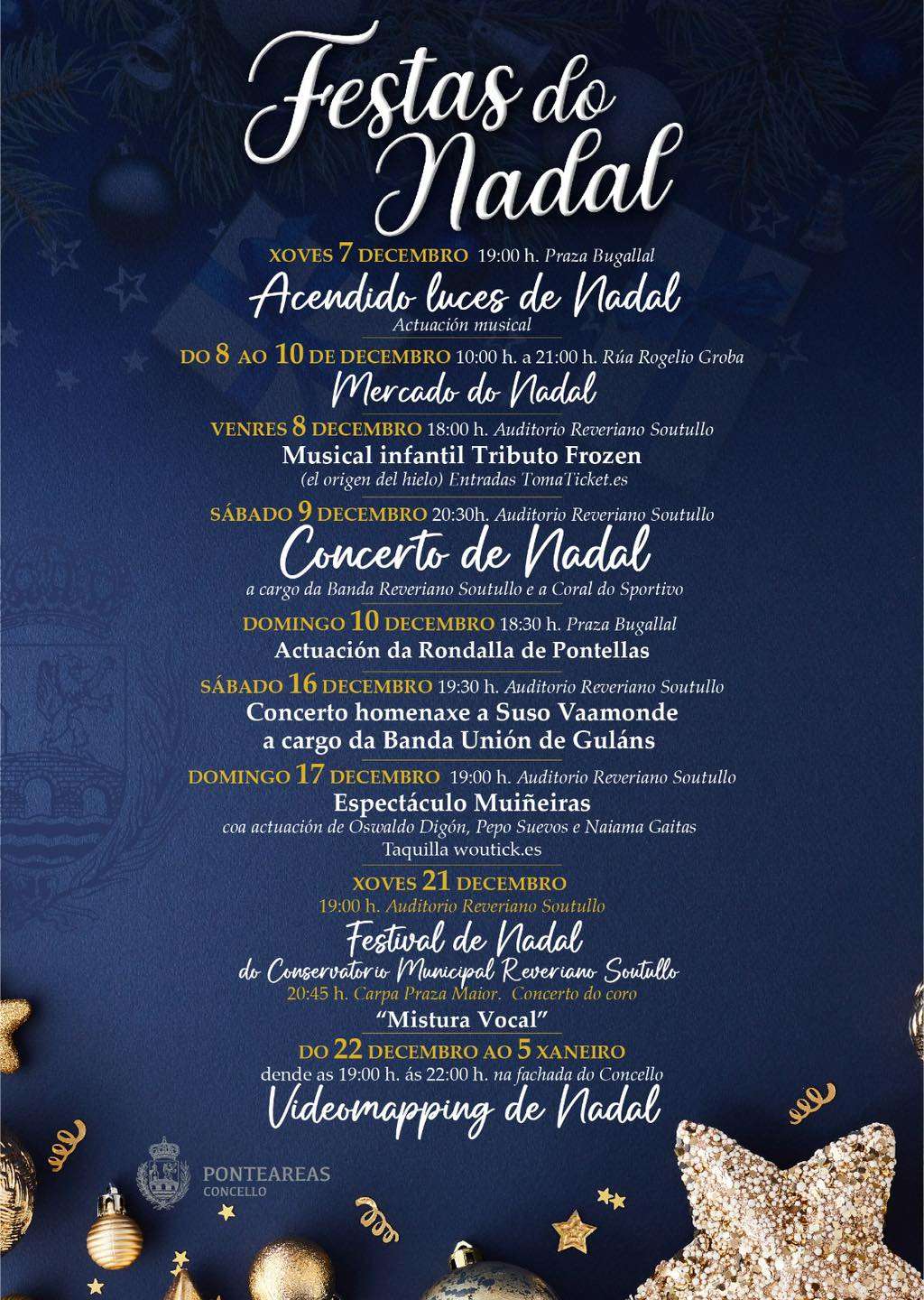 El jueves 21 será una jornada de doble oferta musical con el Festival de Navidad del Conservatorio Municipal Reveriano Soutullo en el auditorio a las 19:00 horas y, a las 20:45 horas, el Coro Mistura Vocal ofrecerá un concierto en la carpa instalada en la Praza Maior de Ponteareas.