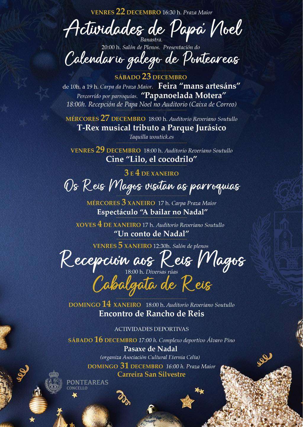 La programación continuará ese mismo viernes 22 de diciembre con diversas actividades de Papá Noel ofrecidas por la asociación de comerciantes de la localidad, Banastra, mientras que, por la noche, a las 20:00 horas, se presentará en el Salón de Plenos el calendario galego de Ponteareas.