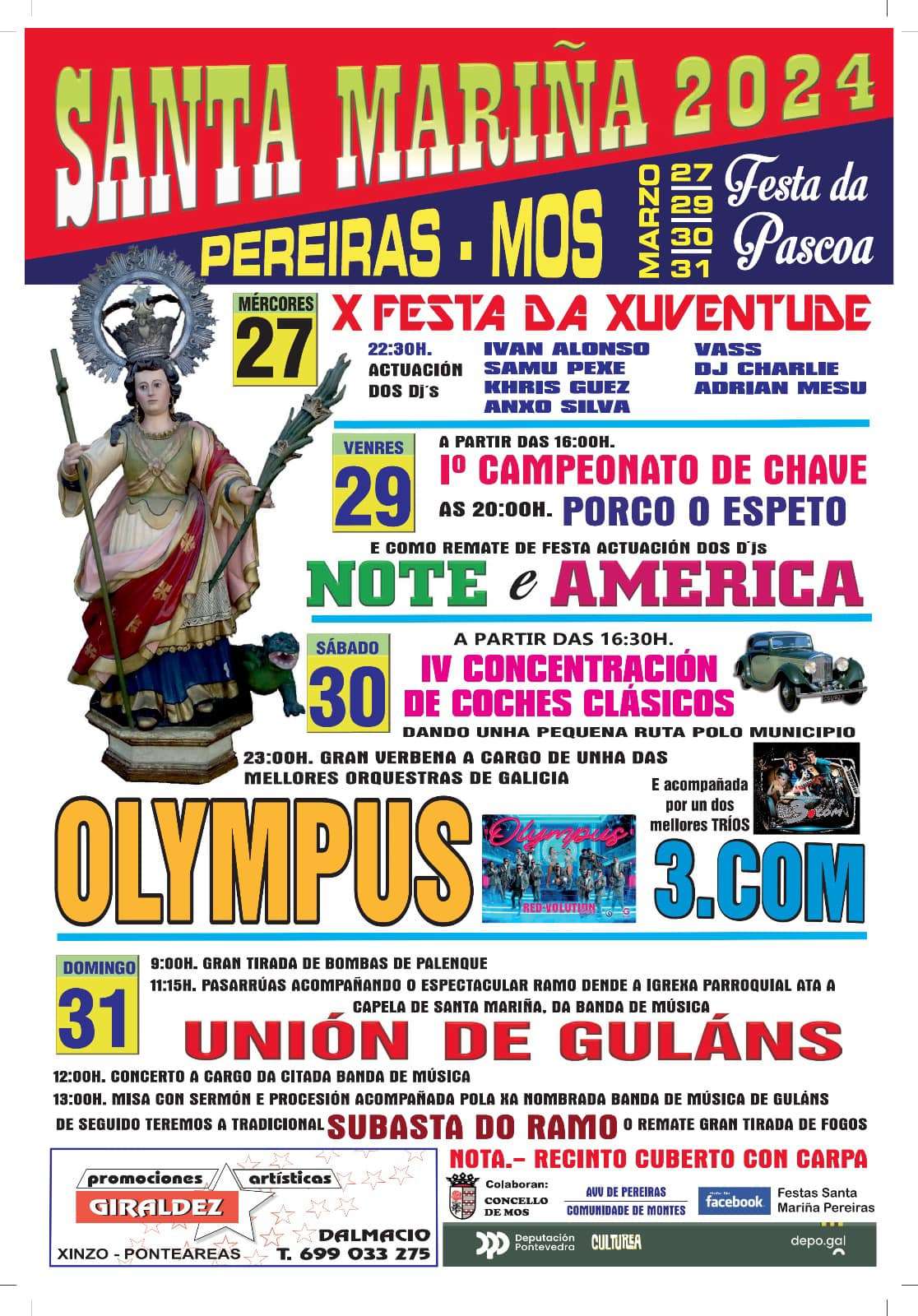 La Pascua se celebra en Mos con cuatro días de música, gastronomía y verbena. Dentro de la Semana Santa podremos encontrar numerosas opciones para pasar los días de descanso, ya sea en las fiestas de San Telmo de Tui, con un concierto gratis de las viguesas Fillas de Cassandra, o, si el tiempo lo permite, disfrutando de los chiringuitos que abrirán en los arenales de Vigo, existen múltiples planes que se pueden realizar en la ciudad olívica y su área metropolitana. Pero dentro de la comaraca de A Louriña, la parroquia mosense de Pereiras brindará la posibilidad de gozar de sus fiestas en honor a Santa Mariña que discurrirán desde este miércoles 27 de marzo hasta el domingo, en las que nos faltarán los DJ’s, orquestas, coches y comida.