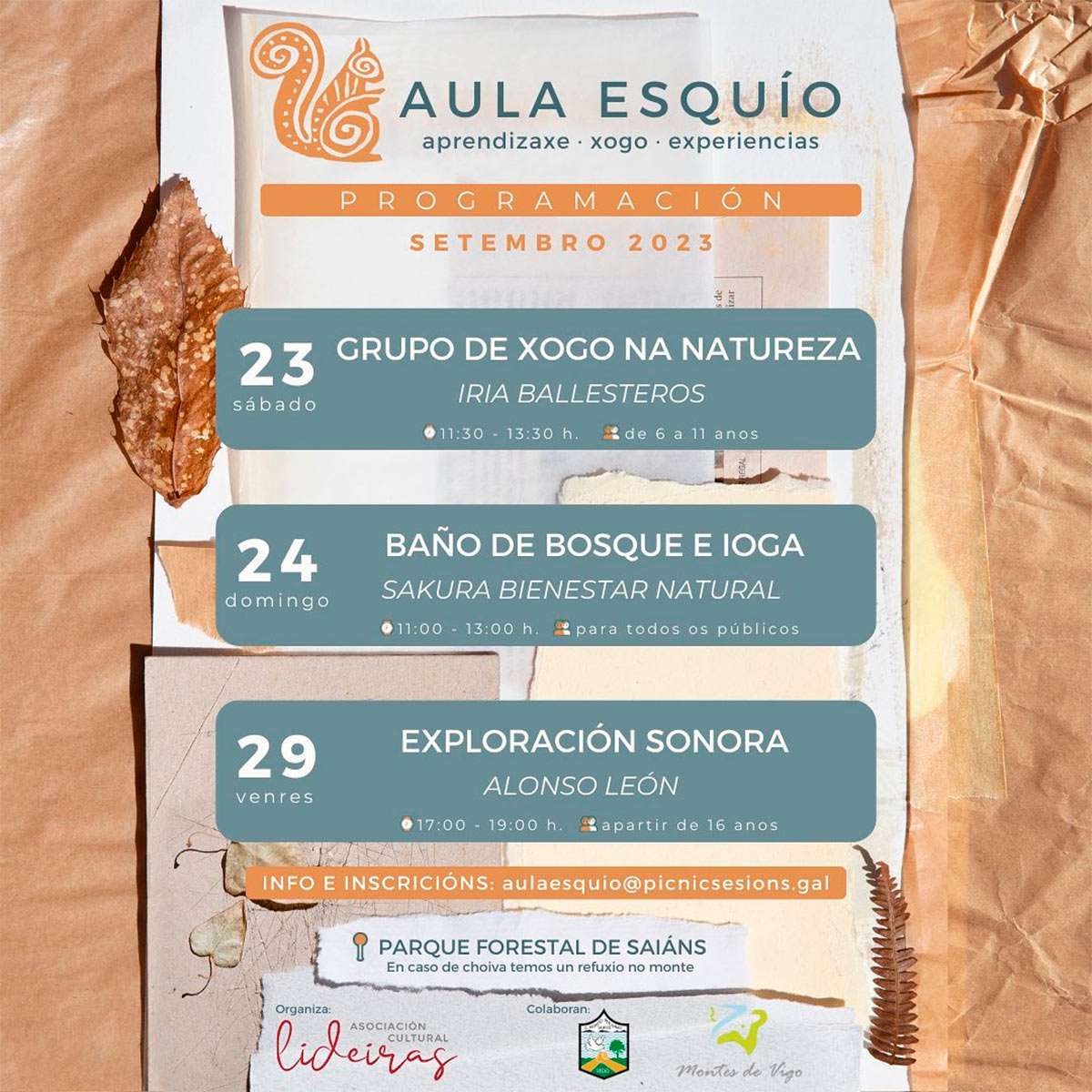 Tras el gran éxito de la segunda edición de Picnic Sesións O Festival de Saiáns, la asociación LIDEIRAS continúa trabajando para seguir proponiendo actividades culturales y experiencias. Así nace Aula Esquío, un nuevo proyecto que ponen en marcha desde la misma asociación con la finalidad de "darlle á natureza o uso de aula, creando así un espazo multidisciplinar onde convivirán o aprendizaxe, o xogo e as experiencias para conseguir que o Monte de Saiáns sexa un monte social", explican desde la organización.