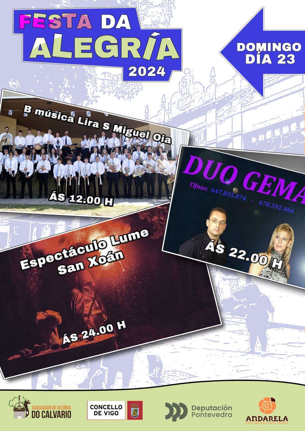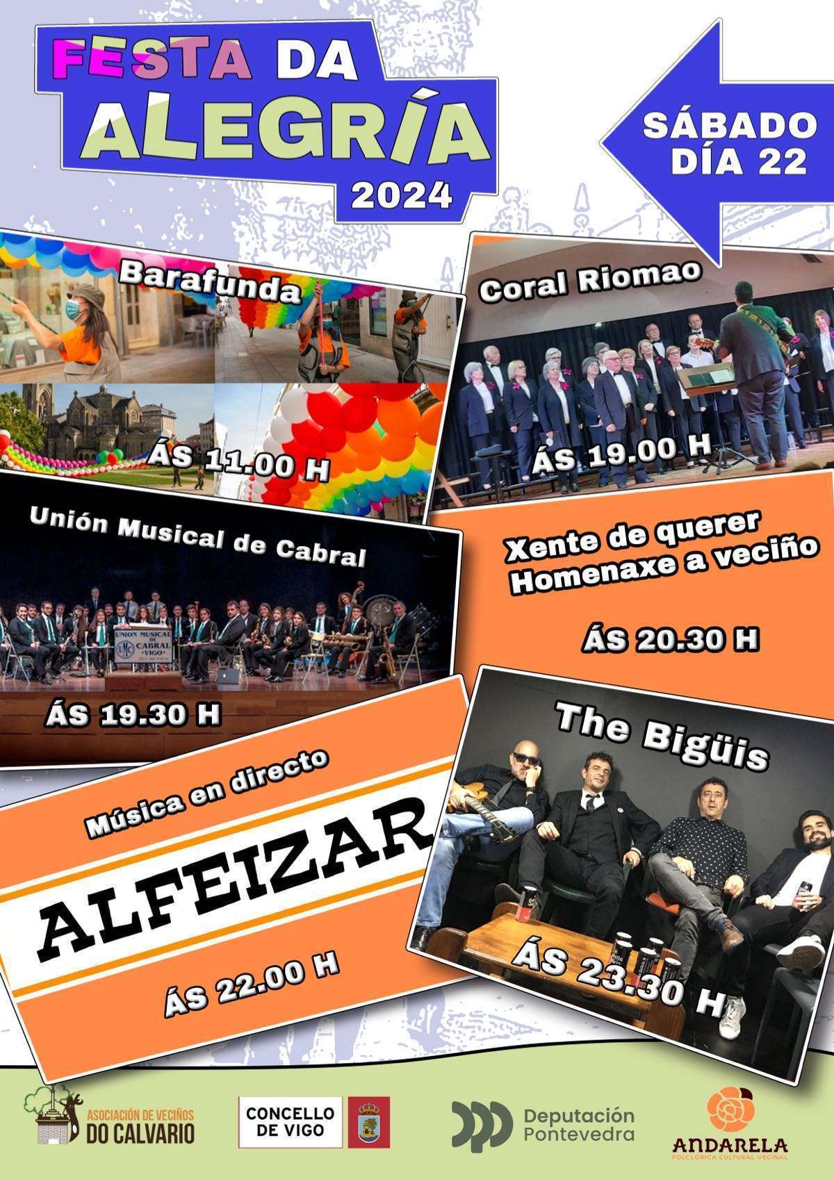 O Calvario llega este fin de semana al fin de la celebración de la Festa da Alegría, que llena el barrio de actividades y conciertos. El sábado la programación arrancará a las 11:00 horas con un pasacalles de Barafunda. Ya por la tarde, se sucederán las actuaciones desde las 19:00 horas con Coral Riomao, Unión Musical de Cabral, Alfeizar o The Bigüis. El domingo habrá música a las 12:00 y a las 22:00 horas, mientras que a medianoche se celebrará un espectáculo de fuego por San Xoán.