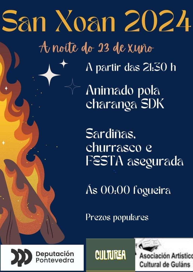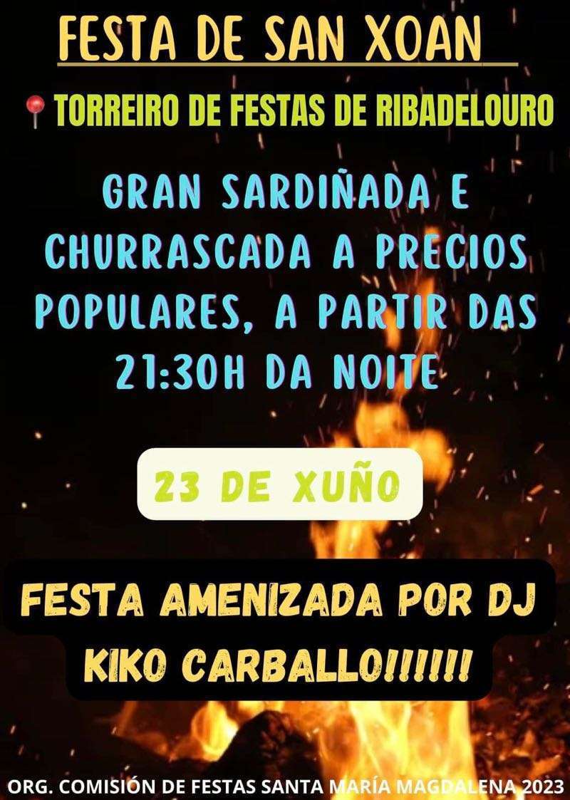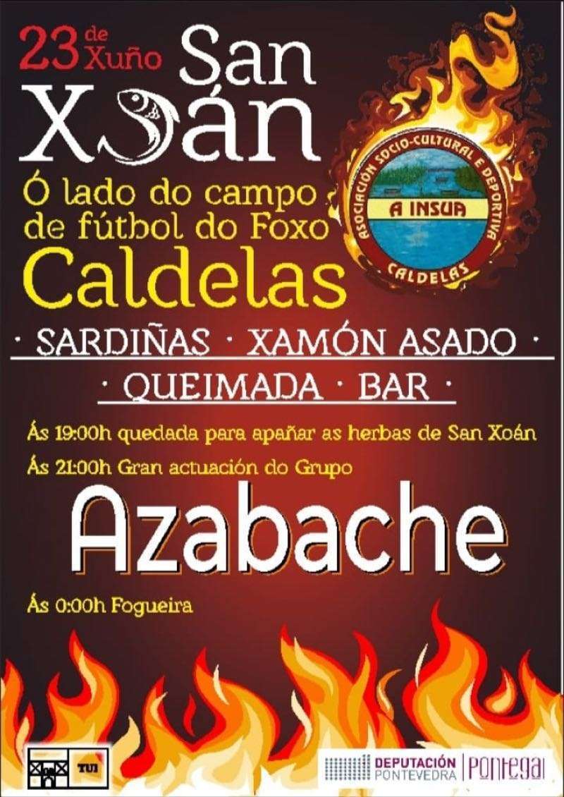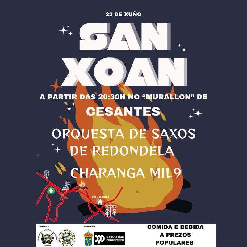 El domingo 23 por la tarde se celebrarán grandes cucañas desde las 17:00 horas y a partir de las 20:00 horas las actuaciones de Cantareiras Bouzacoba, grupo de Gaitas os Tabáns, Grupo de Baile Vai na Herba y Operación Karuncho. Habrá también sardinas y churrasco y a partir de las 0:00 horas se encenderá la gran hoguera de San Xoán. La verbena correrá a cargo de Va de Retro y Taitantos.