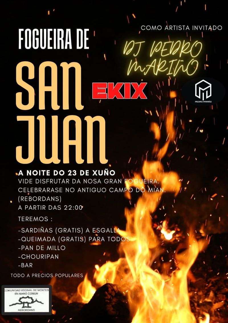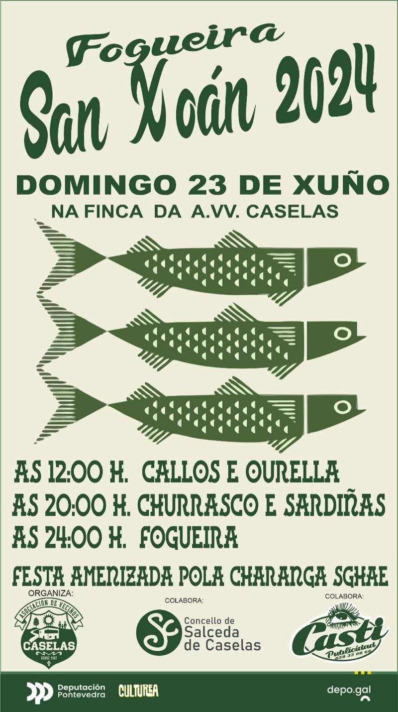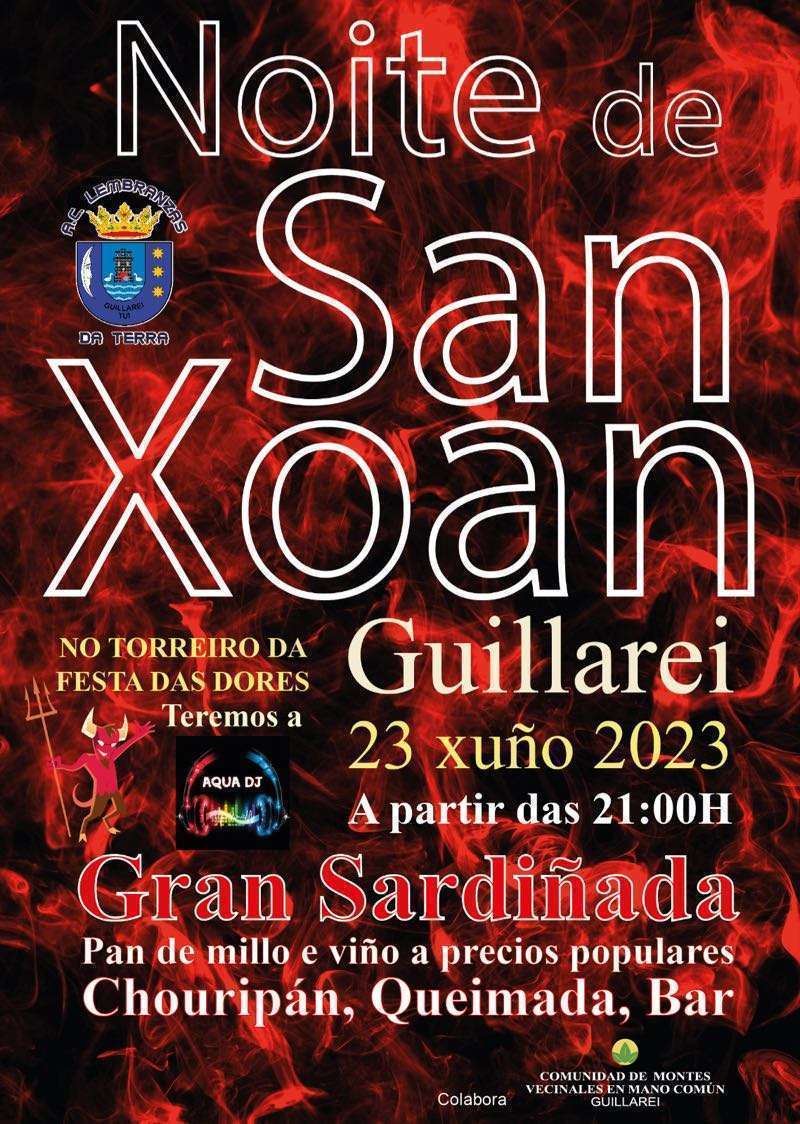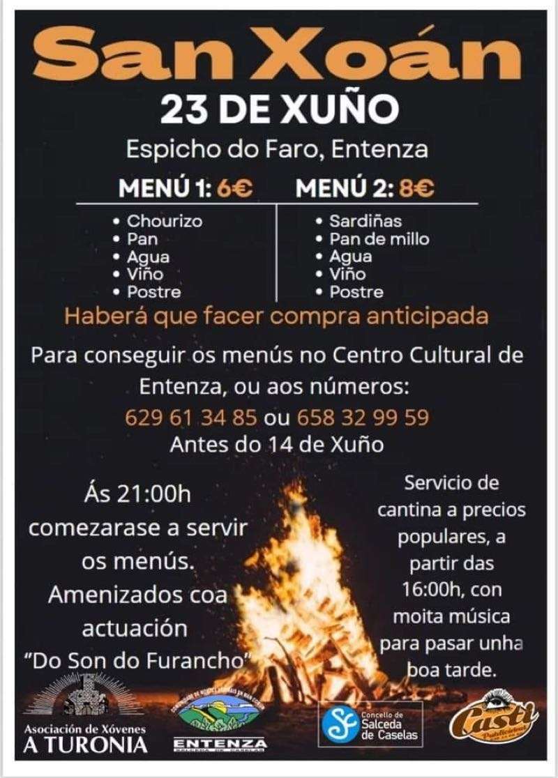 El domingo 23 por la tarde se celebrarán grandes cucañas desde las 17:00 horas y a partir de las 20:00 horas las actuaciones de Cantareiras Bouzacoba, grupo de Gaitas os Tabáns, Grupo de Baile Vai na Herba y Operación Karuncho. Habrá también sardinas y churrasco y a partir de las 0:00 horas se encenderá la gran hoguera de San Xoán. La verbena correrá a cargo de Va de Retro y Taitantos.
