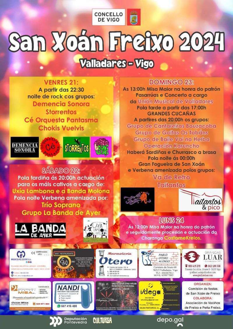 Dentro de las múltiples celebraciones de San Xoán, en Freixo (Valladares), celebran por todo lo alto la festividad a lo largo de todo el fin de semana. Tras arrancar el viernes con una noche de rock, el sábado por la tarde la programación estará pensada para los más pequeños con Uxía Lambona e a Banda Molona a partir de las 20:00 horas. La verbena nocturna correrá a cargo de Trío Soprano y Grupo La Banda de Ayer.