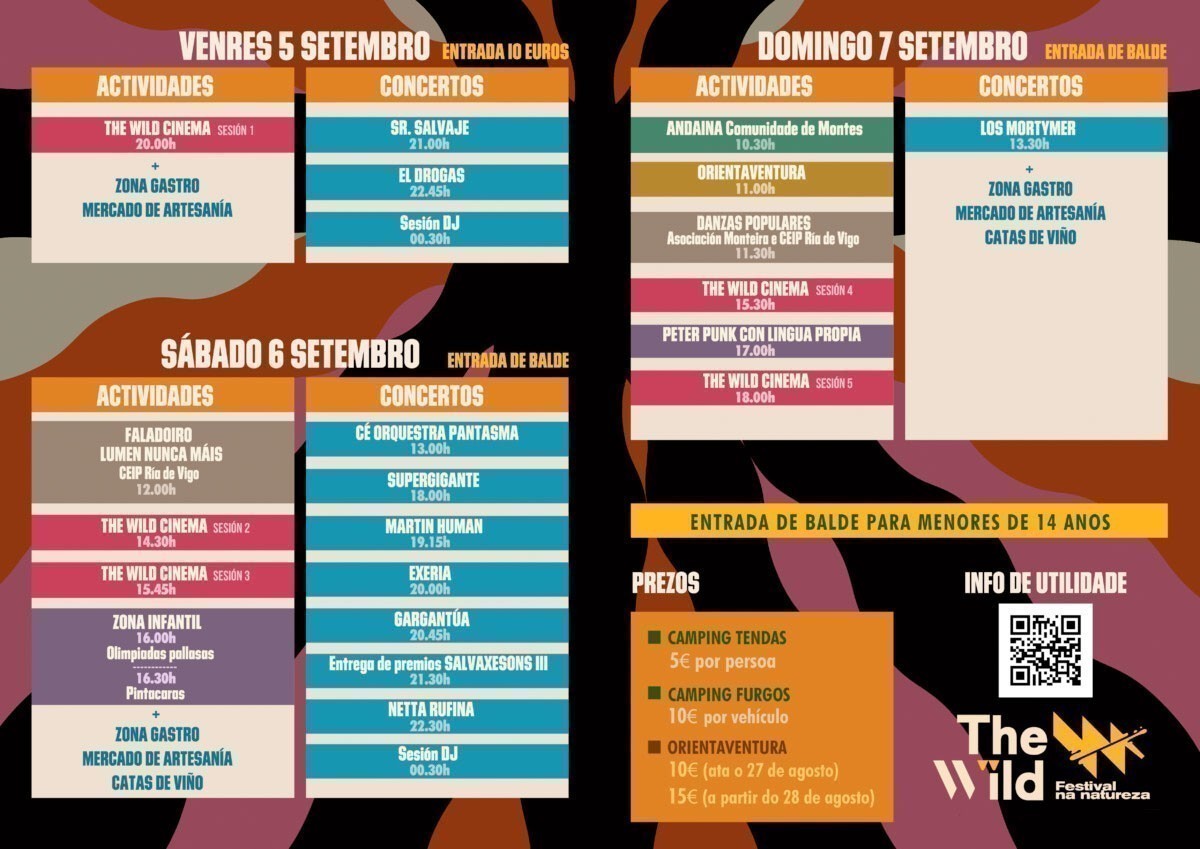 Por otro lado, el resto de la programación musical tiene un importante sello gallego. Nueve de las diez bandas son de la comunidad gallega, además de poner en valor las oportunidades que The Wild brinda a las bandas emergentes locales a través del concurso Salvaxesons que presenta el periodista Rafa Valero. Consolidado ya como una de las citas más singulares del verano en Galicia, el festival mezcla música en directo, naturaleza y actividades para todas las edades en un formato multidisciplinar, sostenible y familiar. La filosofía del festival apuesta por ir más allá de la música para "ofrecer una experiencia" en la que el Parque Forestal de San Miguel de Oia se convierte en escenario natural de conciertos, espectáculos, cine, juegos y actividades al aire libre.
