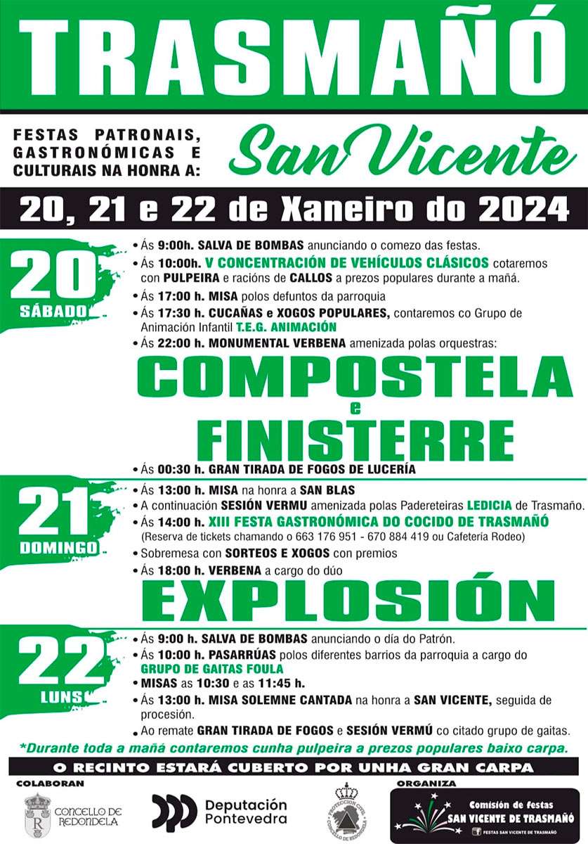 La fiesta, organizada por la Comisión de festas de San Vicente de Trasmañó, tendrá lugar los días 20, 21 y 22 de enero en el torreiro de fiesta, que estará cubierto por una gran carpa. El primer gran evento de la programación será la quinta edición de la Concentración de Vehículos Clásicos, que comenzará a las 10:00 horas del sábado 20 de enero, después de la salva de bombas, y contará con pulpeira y ración de callos a "precios populares" durante la mañana.