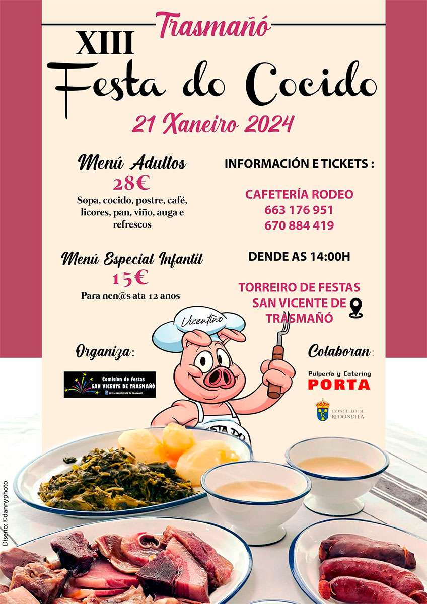 En el marco de esta programación de tres días, la Comisión de festas San Vicente de Trasmañó celebrará la tradicional Festa do Cocido, que llega este 2024 con su décimo tercera edición. La cita gastronómica en honor a este plato invernal será uno de los grandes reclamos de la jornada del domingo 21 de enero en el Torreiro de Festas de San Vicente de Trasmañó.