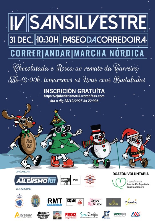 La prueba, organizada por el Club Atletismo Tui, contará con un avituallamiento especial en esta última jornada del año. Las personas participantes en esta San Silvestre Solidaria en Tui podrán tomar un chocolate caliente. Además, podrán tomarse también las 12 uvas al mediodía, para festejar, por adelantado, el final del año 2025. Para completar esta celebración deportiva habrá música y un dj para animar la velada.