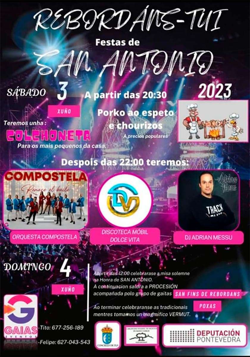 Este sábado y domingo la parroquia de Rebordáns, en Tui, festejará las Festas de San Antonio con las actuaciones de la orquesta Compostela, la discoteca móvil Dolce Vita y DJ Adrian Messu a las 22:00 horas. Además, a partir de las 20:30 horas también habrá porco ao espeto y chorizos a precios populares y una colchoneta para los más pequeños. El domingo la fiesta finalizará con un sesión vermú y las tradicionales poxas.