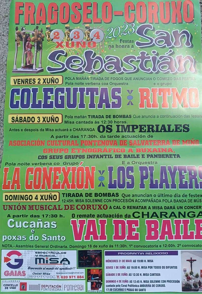 La parroquia viguesa de Coruxo celebrará este fin de semana las fiestas en honor a San Sebastián en Fragoselo, que arrancarán con una gran verbena este mismo viernes a cargo de Los Coleguitas y el grupo Ritmo. Además, durante el sábado y el domingo la programación acogerá las actuaciones del grupo La Conexión, la orquesta Los Players, la charanga Vai de baile y la celebración de poxas y cucañas. También en Vigo tendrá la lugar la Festa de Veteráns en el barrio de Coia, un evento multicultural que promete música, baile, mercadillos de artesanía y vintage, atracciones y gastronomía hasta el domingo.