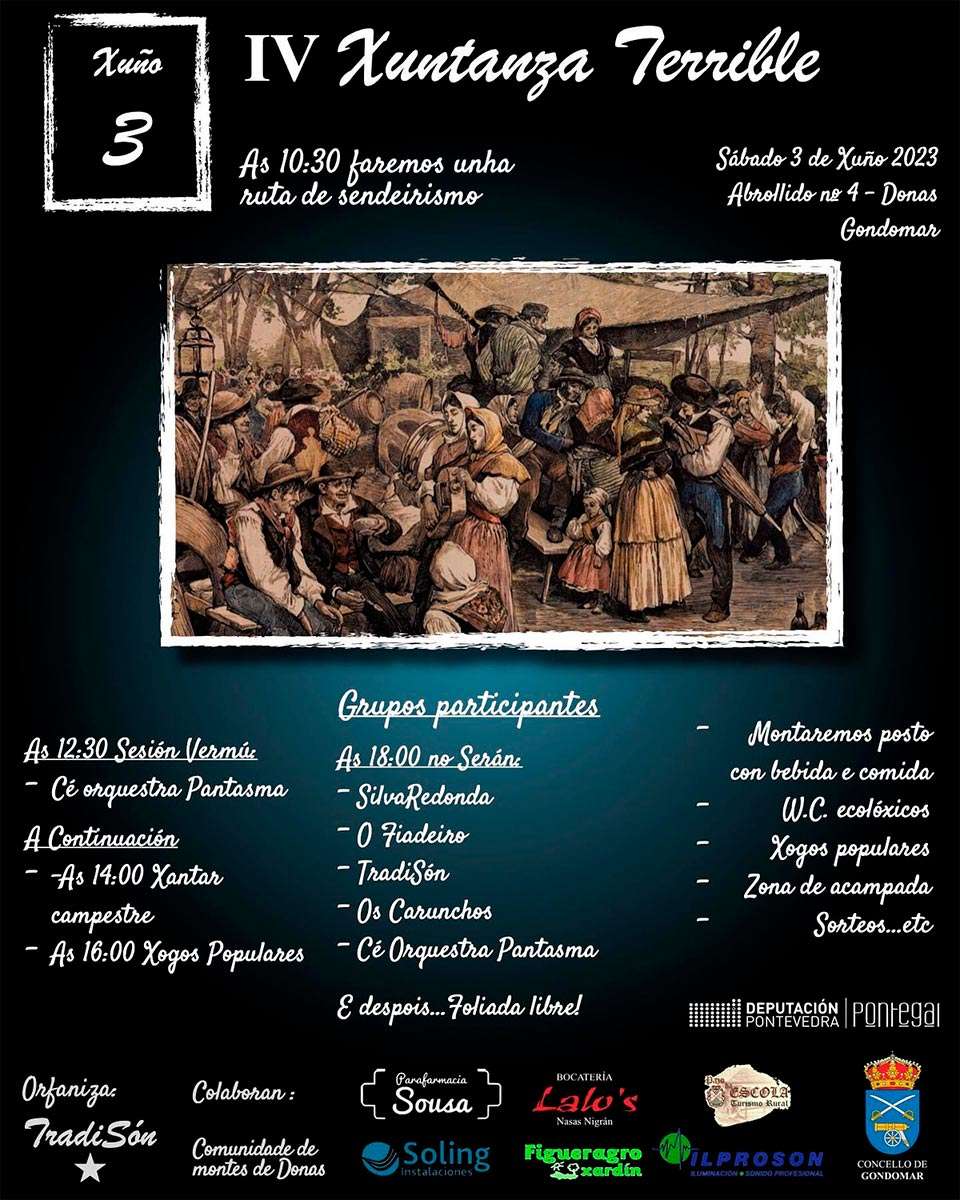 Por su parte, en Donas, Gondomar, este sábado se celebrará la IV Xuntaza Terrible que contará una ruta de senderismo a las 10:30 horas, una sesión vermú amenizada por Cé Orquestra Pantasma, un xantar campestre, juego populares y las actuaciones de Silva Redonda, O Fiadeiro, TradiSón y Os Caruchos.