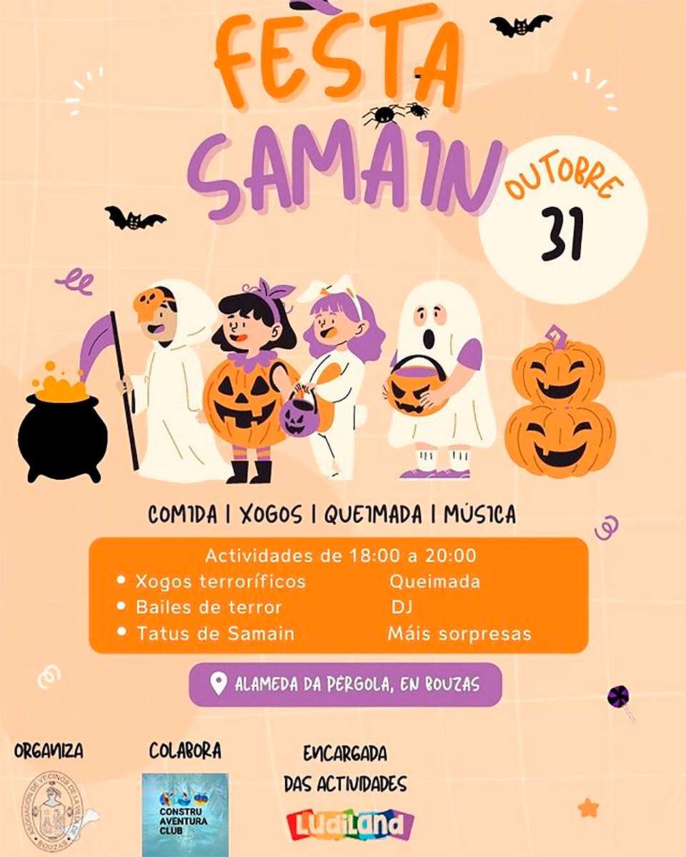 Pero esto no es todo, la programación de la Asociación de Vecinos de Bouzas para despedir el mes de octubre continúa con la Festa de Samaín que se celebrará en el martes 31 de octubre. Esta fiesta, con actividades para todos los públicos, tendrá lugar también en la Alameda da Pérgola, entre las 18:00 y las 20:0 horas.