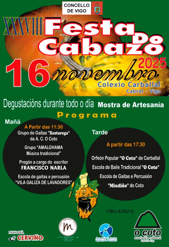 La Asociación Cultural O Coto, que es quien organiza esta fiesta en Vigo, ha preparado atractivos suficientes para combinar con sus recetas personales. Así, la jornada arrancará a las 11:30 horas con música a cargo del grupo de gaitas Xestarega, el grupo Amalghama y la escuela de gaitas y percusión Vila Galiza de Lavadores. Al terminar la mañana, tendrá lugar la tradicional lectura del pregón, en esta ocasión con la voz del escritor Francisco Narla.