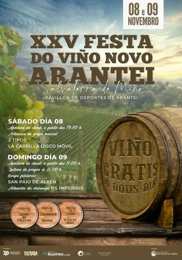 De esta forma, la parroquia de Arantei se prepara para acoger la XXV edición da Festa do Viño Novo. Durante el sábado 8 y el domingo 9 de noviembre se ofrecerá vino gratis en el Pabellón de Deportes de Arantei. Serán dos días en los que Salvaterra de Miño se llenará de buena música y sabor en una festividad cargada de tradición.